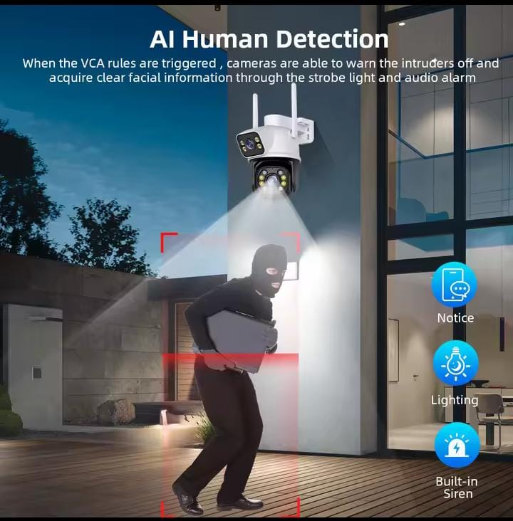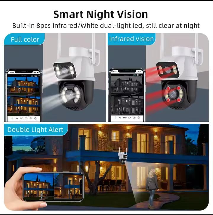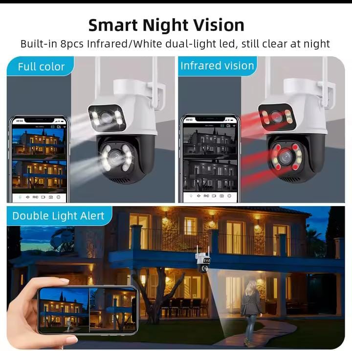 دقة عالية: مصممة للحصول على عدسة مزدوجة، وكل عدسة لها 3 ميجابكسل، ستوفر لك كاميرا المراقبة بدقة 6 ميجابكسل صورة واضحة لرؤية وشاشة جيدة.